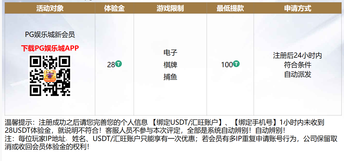 活动详情:新用户注册绑手机号和usdt地址 一小时内自动赠送28usdt 没送就是不符合具体自测  游戏和提款限制自行查看优惠